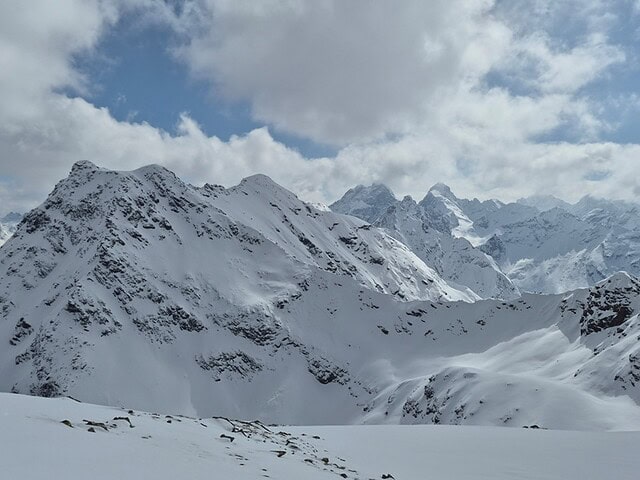 Die Samnaungruppe befand sich bereits in einer undurchsichtigen Wolkendecke, sodaß nicht einmal deren höchster, der Muttler (3.294 m) mit der selben Entsprechung wie jener in der Kette gegenüber nicht ausgemacht werden konnte. Für die mehrfach in den Ötztaler Alpen und der Samnaungruppe vorkommenden Berge mit der Bezeichnung „Muttler“ erklärt Judith Jambor[3] die Benennung aufgrund ihrer unspektakulären Form nach einem Widder, der sich die Hörner abgestoßen hat und als „Muttl“ bezeichnet wird, mit dem Ursprung in „mutilus“ für „verstümmelt, hornlos, abgehackt“.