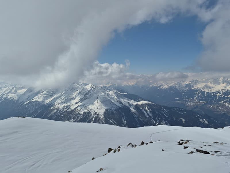 Leider vereitelte eine große Nebelbank den Blick auf den Glockturmkamm und die Sicht auf den namengebenden Glockturm (3.355 m) war uns verwehrt. Ab den Gamsköpfen (2.806 m) im Südwesten im Tal gegenüber bestand wieder Sicht jedoch nur bis zu einem westlichen Vorposten der Ötztaler Alpen, dem Schmalzkopf (2.724 m) bei Nauders in 25 km Entfernung.