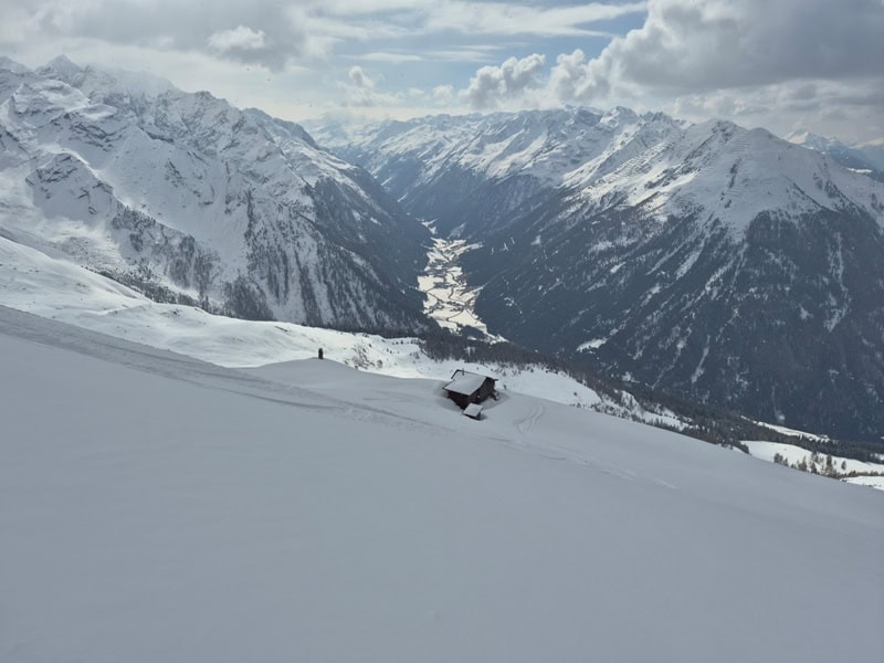 Im Bereich zu steilerem Gelände hin trafen wir auf die kleine Jagdhütte auf 2.550 m Seehöhe. Dort konnten wir entscheiden im Abfahrtssinn rechts über den Hang, der durch eine Felsrippe begrenzt wird, oder links über die schön kupierten Hänge des Roßbodens abzufahren. Die linke Seite, die im unteren Teil Schneesicherheit versprach, wurde ausgewählt. Die Schneeverhältnisse auf der Abfahrt rechts konnten von oben nicht genau eingesehen werden.