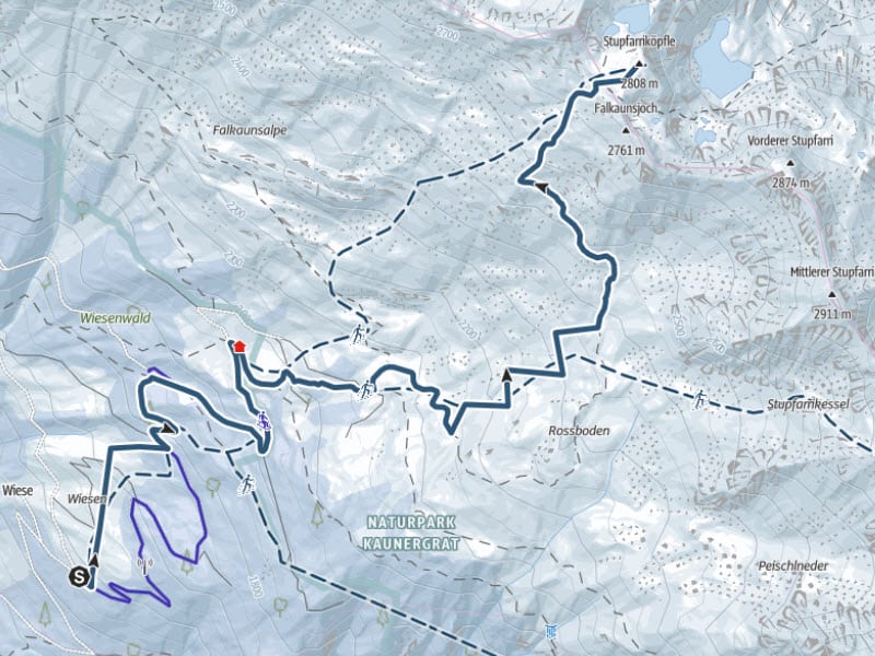 Nördlich oberhalb des Wegs, der sich in drei Richtungen teilt, liegen die weiten Hänge unterhalb des Stupfarriköpfles im äußeren Teil des Kaunergrats. Wir stiegen auf der vorgespurten Route weiter, um abermals den Fahrweg zu erreichen, der auf den Roßboden führt, unter die weiten Hänge des Stupfarriköpfles. Mittig waren die Hänge durch Ausaperung bereits unbefahrbar und auch steiler, schrofiger als zu beiden Seiten. Der Aufstieg links wird in Tourenführer ebenfalls beschrieben, doch dürfte der Aufstieg rechts als Normalaufstieg zu interpretieren sein, da er über leichteres, kupiertes Gelände führt, am Rand des Roßbodens.