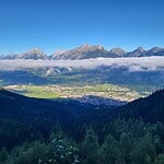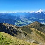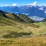 - links der Malgrübler, rechts in der Ferne die Stubaier Alpen, rechts der Bildmitte das Karwendel
