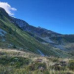 Die Aussichten auf eine leichtere Umgehung schwanden beim Blick nach unten in die grasbewachsene, steile Rinne. Zwar ist dort der Boden ebenfalls fest, die Graspartien jedoch unangenehm und wir suchten jedes kleine felsige Fleckchen, um den Fuß darauf zu setzen. Ob wir mit der Variante des Abstiegs von etwa 30 Hm den Teufel mit dem Beelzebub ausgetrieben hatten, erfuhren wir nach der Übersteigungen der nächsten Rippe, hinter der das Gelände zum Wiederaufstieg sichtbar wurde.