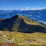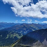Der Blick nach Süden eröffnete die Sicht auf die drei markanten Spitzen der Reichenspitzgruppe nämlich dieselbe, die Wildgerlosspitze und der Kuchelmooskopf. Links davon, nach dem die Verschneidung mit der Silhouette des Zeller Schigebiets den Fernblick freigibt, taucht die Wildkarspitze auf und, mit freiem Auge kaum sichtbar, noch weiter links gerade noch sichtbar, der Großvenediger.