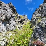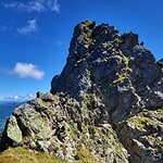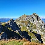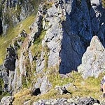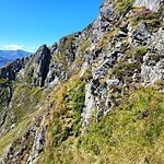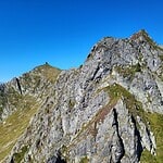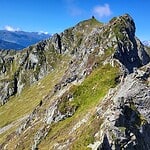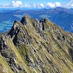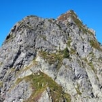 Zunächst beginnt der finale Abstieg der felsigen Gratstrecke mit der Zuspitzung des Grates und wenigen Schritten unter Benutzung der Hände zur Überkletterung von kleinen Felszinken.