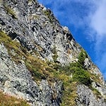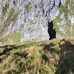 Dort fanden wir nur mehr eine griffarme Platte vor, unter der in der Erinnerung ein schmaler Felsriss schräg und steil nach unten führte. Dieser Teil befindet sich zwar vollständig im Fels, bietet jedoch wenig Haltemöglichkeiten und war dennoch angenehmer als die Wiesenpolster oberhalb.