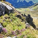 Allein die Erkenntnis, daß ein einziger, selbst unter Föhneinfluß stehender Tag der Trocknung nach einem Regentag nicht ausreicht, um auf den steilen Grasflanken felsische Sicherheit des Schrittes zu erlangen, ließ uns beim ersten legeren Abstieg in an sich leichtem Gelände zur Konzentration zurückkehren. Die hohen Grasbüschel, in denen sich Feuchtigkeit und Restnässe hielt, erwiesen sich tückisch und in Schattenpartien verborgen. Der Lauf der Sonne parallel zur Gratrichtung hielt Rutschflächen bis nach ihrem Hochstand zur Mittagsstund bereit, stets in westseitigen Schattenbereichen.