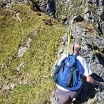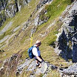 Mühsam und über Grasnarben kämpften wir uns wieder auf die Grathöhe zurück und gelangten auf den nun schmäleren auslaufenden Grat des Abstiegs. Am letzten Zapfen vor der Westflanke waren wieder Abseilstellen angebracht, denen wir allerdings kein Vertrauen schenkten und die kurzen Reepschnüre gar nicht erst auspackten.